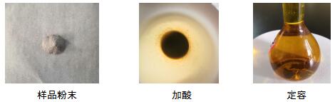 實驗結(jié)束,待冷卻至60℃以下,壓力為零,取出罐架轉(zhuǎn)移至通風(fēng)櫥中,打開消解罐,趕酸后定容至50mL容量瓶中。