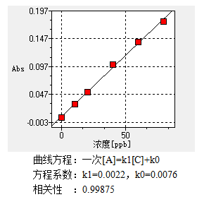 鉛標(biāo)準(zhǔn)使用液:準(zhǔn)確吸取適量鉛標(biāo)準(zhǔn)儲(chǔ)備液于50mL容量瓶中,用硝酸溶液(2%)定容至刻度,得到含鉛量分別為0mg/L、10μg/L、20μg/L、40μg/L、60μg/L和80μg/L的標(biāo)準(zhǔn)系列溶液。