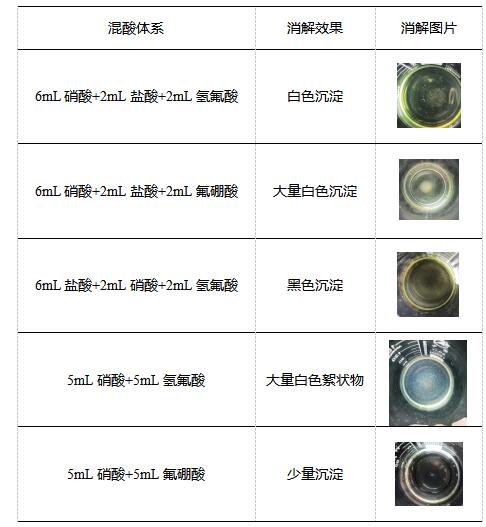 通過實驗發(fā)現(xiàn),硝酸與氟硼酸搭配,樣品消解效果最好。推測樣品中含有大量的硅,同時含有一定量的鈣鎂等易與氫氟酸形成氟化物沉淀的元素,在使用氫氟酸進行實驗時效果不佳。同時實驗發(fā)現(xiàn)硝酸的量在低于5mL時樣品中的碳元素無法完全消解,會存在黑色沉淀,最終選擇硝酸與氟硼酸比例為1:1的混酸體系。